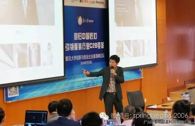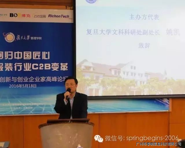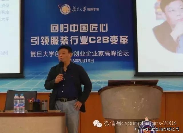 5月18日下午13:00,万众期待的“引领服装行业C2B变革,创新与创业企业家高峰论坛”在复旦大学管理学院如期召开并于下午17:30完美落幕,本次论坛由复旦大学管理学院主办、广州玖鼎信息科技有限公司协助举办,会场内座无虚席,200余人到场参会。论坛邀请了多位资深学者、成功企业家等重磅嘉宾纯干货主题演讲,受到广泛好评,会议进行中掌声持续响起。